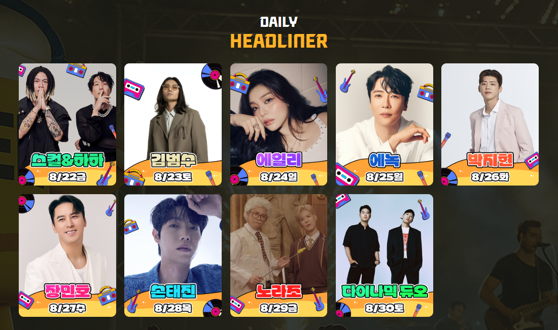 8월 22일 개막일에는 스컬&하하가 축제의 시작을 알리고, 8월 23일에는 김범수의 감미로운 목소리가 송도의 밤을 적실 예정입니다. 8월 24일에는 에일리의 폭발적인 가창력으로 열기를 더할 것입니다.