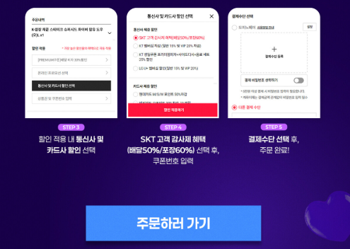 T멤버십 앱을 실행한 후 하단 메뉴를 클릭하고, 고객 감사제 배너를 선택하세요. 배너를 클릭하면 포장 할인(60%)과 배달 할인(50%)을 선택할 수 있는 옵션이 나타납니다. 원하는 방식을 신중하게 선택하세요. 중요한 점은 쿠폰을 다운로드한 후에는 포장/배달 방식을 변경할 수 없다는 거예요.